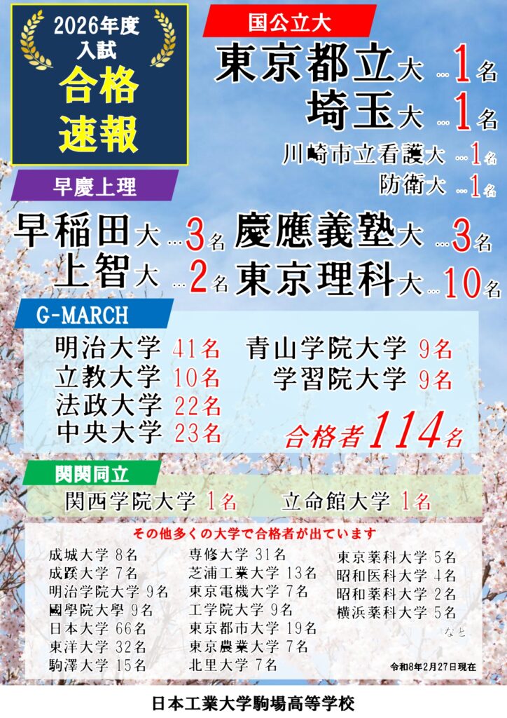 大学入試は続いていますが、令和8年2月27日現在で国公立大学4名を始め、早慶上理18名、G-MARCH 114名などの結果となっています。G-MARCHについて昨年度を大幅に超えました。