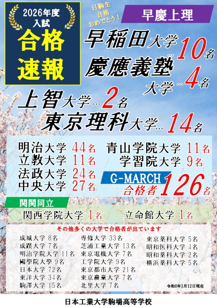 令和8年3月12日現在で京都大学を始め国公立大学11名、早慶上理30名、G-MARCH126名などの結果となっています。G-MARCHについて昨年度を大幅に超えました。