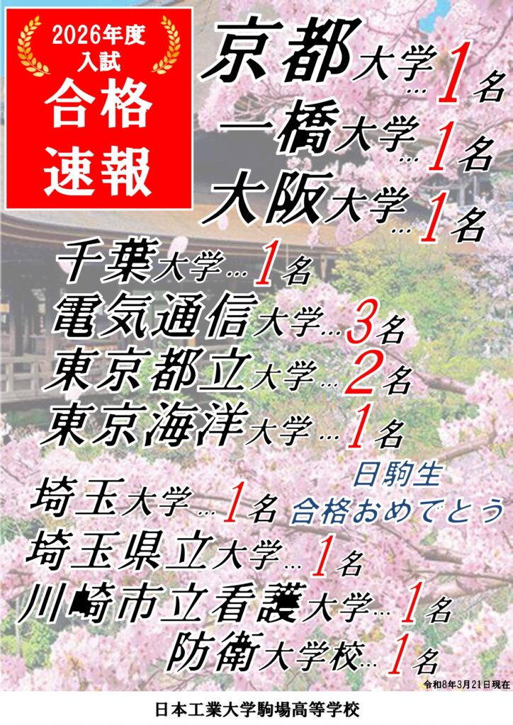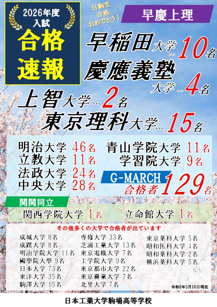 令和8年3月21日現在で京都大学、一橋大学を始め国公立大学14名、早慶上理31名、G-MARCH129名などの結果となっています。G-MARCHについて昨年度を大幅に超えました。